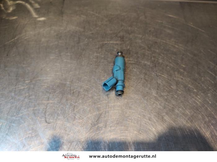 De Injector (benzine injectie) is gedemonteerd uit een Yaris (P1), Hatchback, 1999 / 2005 1.3 16V VVT-i, Hatchback, Benzine, 1.298cc, 64kW (87pk), FWD, 2SZFE, 2002-04 / 2005-09, SCP12