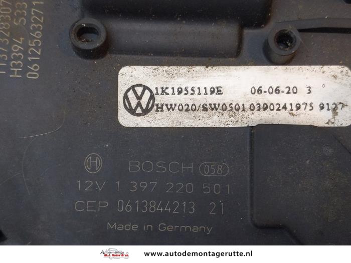 De Ruitenwismotor+Mechaniek is gedemonteerd uit een Jetta III (1K2), Sedan, 2005 / 2010 1.9 TDI, Sedan, 4Dr, Diesel, 1.896cc, 77kW (105pk), FWD, BKC; BLS; BXE, 2005-09 / 2010-10, 1K2